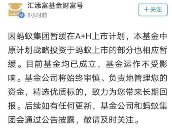 蚂蚁集团AH股暂缓上市,5只战配基金:基金运作不受影响