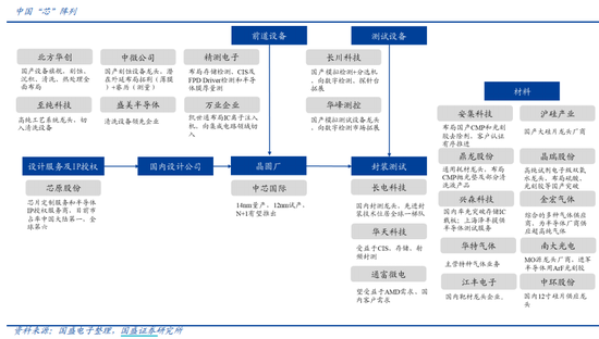国盛证券建议持续关注中国“芯,阵列核心标的,如晶圆代工、封测、IP授权及设计服务、设备材料等国产化机会。中芯国际科创板上市,A股国产半导体家族再得一名大将,随着当前国产半导体板块的日渐完善,已经看到从IP授权及设计服务、设计、晶圆代工、封测设备以及材料多领域的不同程度的国产化出现。