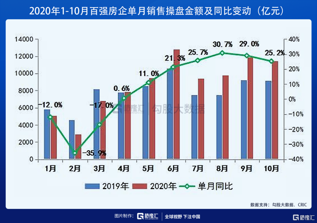 虽然10月份的销售增速较9月份有所放缓,环比下降了3.9%。但整体来看前三个季度的数据是超预期的。2019年前三季度百强房企的操盘销售额24166.9亿元,今年同期是31053.7亿元,同比增长28.5%;销售端今年完全没有受到疫情影响。