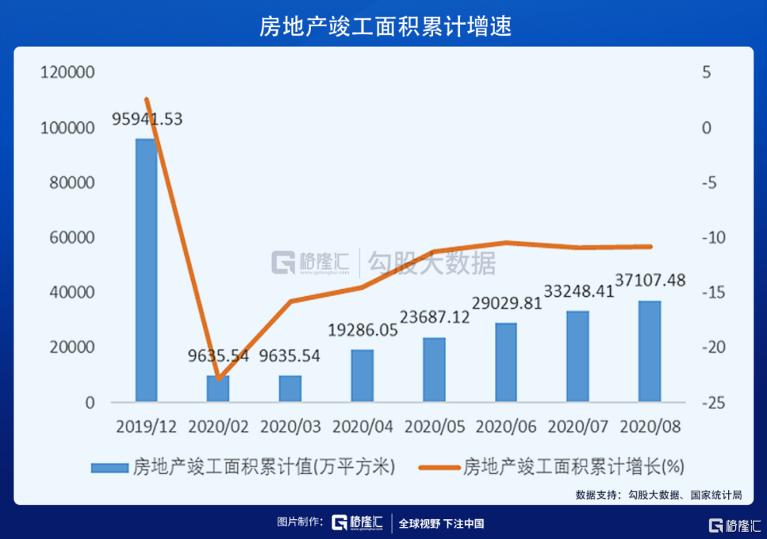融资收紧会直接导致房企现金流紧张,那么地产商就会选择性的做一些事情:促销楼盘回款现金,放缓竣工端避免占用太多资金。因此也出现了在疫情影响下,销售数据持续好转的现象;而竣工端的数据的确惨不忍睹,统计局刚刚发布的数据,2020年1-9月份商品房竣工面积累计增速下滑11.6%,9月单月竣工面积增速同比下滑17.7%。