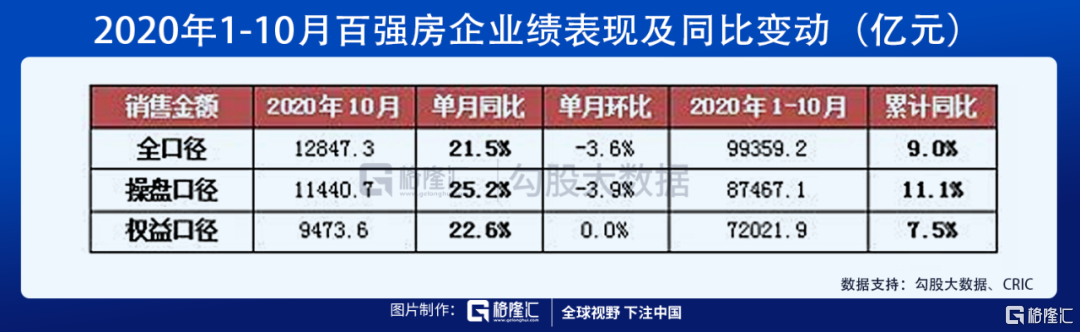 既然房企有销售回款的动力,在地产股业绩增速普遍放缓的情况下,可以重点关注销售数据这项指标。整体来看,1-10月份TOP100房企操盘销售规模99359.2亿元,同比增长9.0%;10月单月销售金额11440.7亿元,同比增长25.2%。