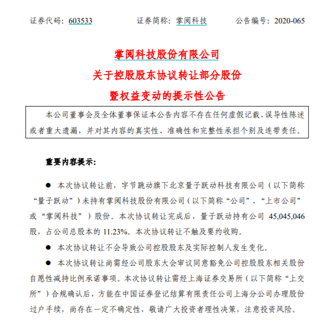 掌阅科技表示,本次协议转让不会导致公司控股股东、实际控制人发生变化,公司一直专注于数字阅读领域,字节跳动在广告投放、商业化服务、搜索以及技术平台支撑方面在行业内有领先优势,通过本次协议转让引入量子跃动成为公司重要股东,有利于公司引进优势资源,有利于提升公司整体竞争力。