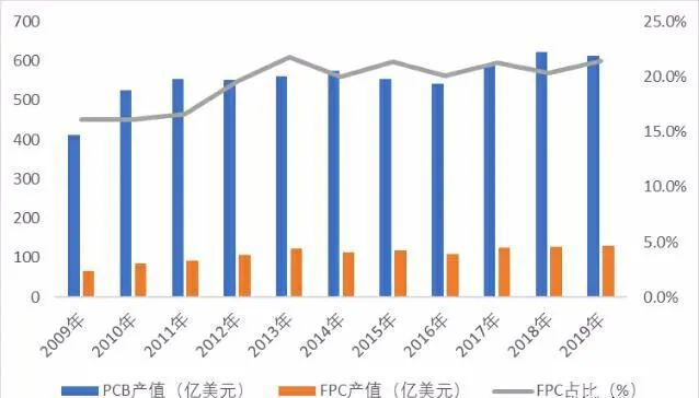 2009年~2019年全球PCB及FPC行业产值情况图片来源:普华有策