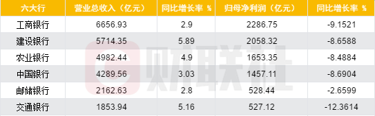 其中,六大行实现的归母净利润均同比出现下滑,合计实现的归母净利润约为8511亿元,较上年同期的9317亿元减少806亿元,降幅为8.6%。