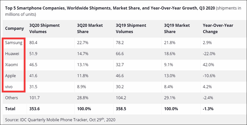 三季度全球手机市场出货数据图片来源:IDC咨询