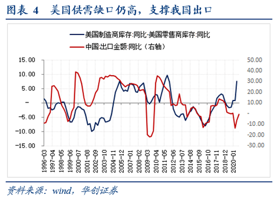 美国经济修复存在结构性差异,消费端修复强于生产端、生产端中消费品生产强于中间品生产,进而带来经济中供需缺口仍高企。当下对我国出口外需而言,美国经济的绝对位置不如经济结构的相对变化重要。具体来说,由于美国疫情不断反复阻碍工业企业复工、同时前期财政刺激提升居民可支配收入,因而美国经济修复的过程中呈现明显的消费强、生产弱的特征。而在生产端内部,消费品生产的修复力度也强于设备等中间品的修复力度。由此带来了美国经济修复过程中供求缺口高企。在国内生产受阻的情景下,需求端缺口主要由进口弥补,因而对我国出口形成有力拉动。(详见《【华创宏观】经济未来修复斜率或放缓,供需缺口支撑我国出口需求——美国三季度GDP点评》)。