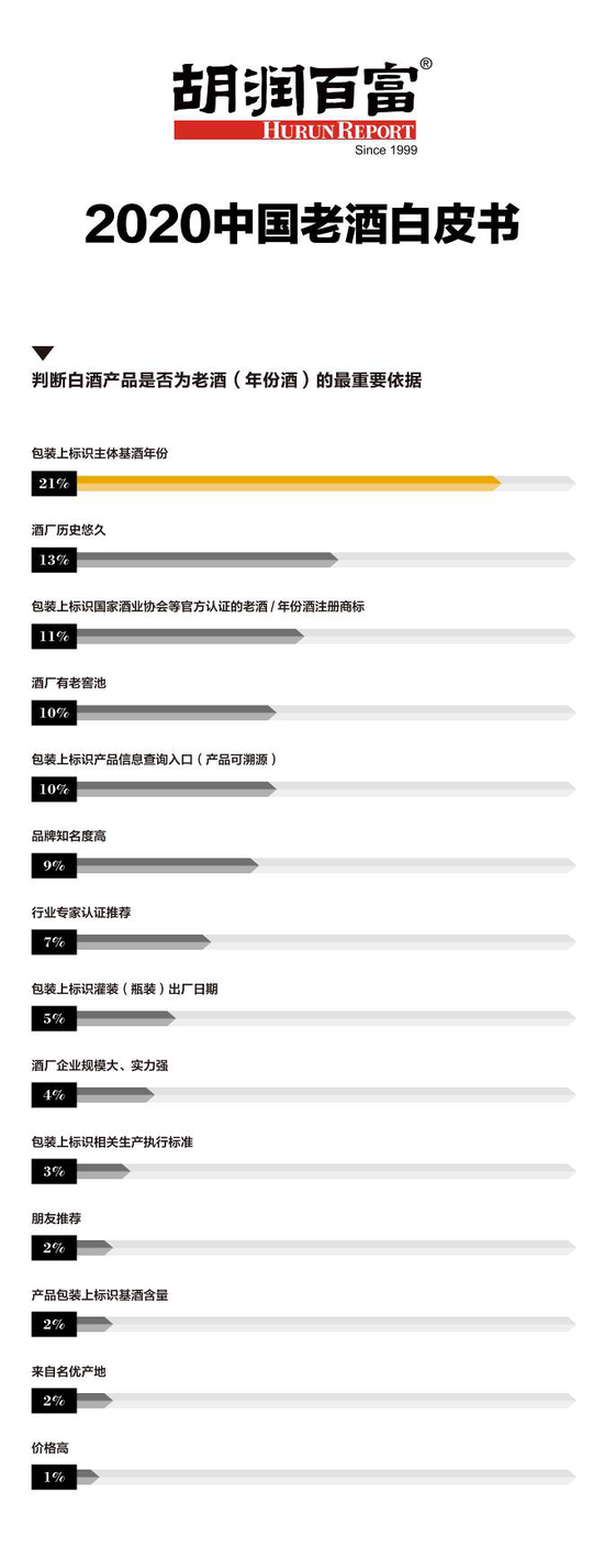 当问及高净值饮酒人群会或期望通过哪些标准去判断白酒产品是否为老酒(年份酒)时,结果显示他们认为最重要的三大依据分别是:包装上标识主体基酒年份(21%)、酒厂历史悠久(13%)和包装上标识国家酒业协会等官方认证的老酒/年份酒注册商标(11%)。