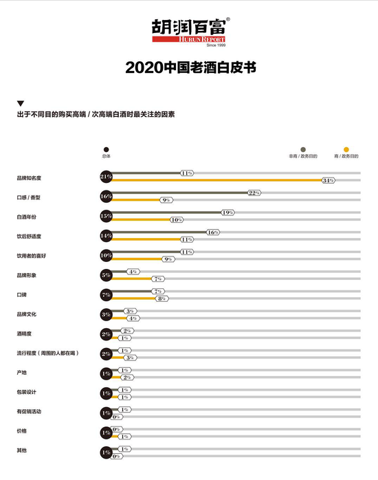 近六成高净值饮酒人群通常是出于非商/政务目的而自己购买高端/次高端白酒,如自饮/家庭宴请、送亲友、收藏投资等。在购买非商/政务用的高端/次高端白酒时,相比“品牌”,他们更重视白酒在口感/香型、白酒年份及饮后舒适度方面的表现。