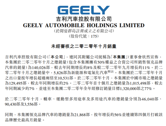 于2020年10月的总销量中,5826部为新能源和电气化汽车。集团于2020年10月的出口量按年增长超过两倍至10531部。于2020年10月,集团于中国市场的总销量为12.95万部,较去年同期增长约2%。