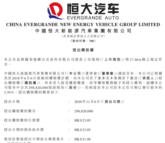 恒大汽车:授出公司雇员董事2.99亿股购股权 占公司股本3.4%