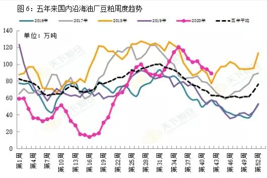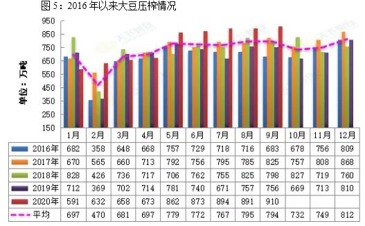 伴随着下半年大豆进口激增,国内油厂大豆压榨量同样大幅增加,如下图5所示,2020年5月开始,月度压榨量维持在860万吨以上,或周度压榨量在200万吨以上。