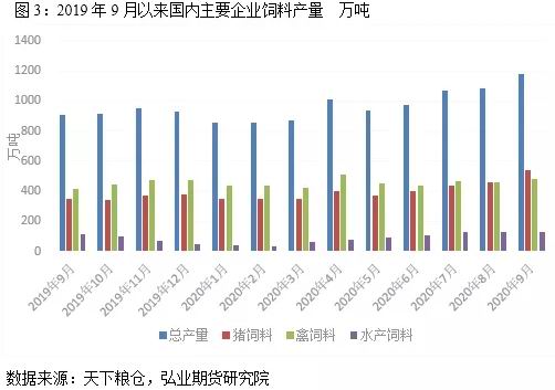 如图3所示,全国1135家饲料企业2020年9月饲料总产量1182.77万吨,环比增加8.97%,同比增加29.91%;其中猪料538.43万吨,环比增加17.38%,同比大增31.16%,禽料481.21万吨,环比增加4.15%,同比增加10.15%,水产料因季节性因素下降至127.57万吨,环比减少4.40%,但同比增加15.52%。