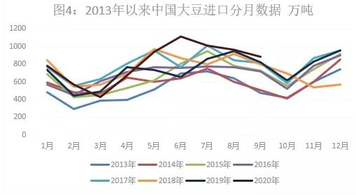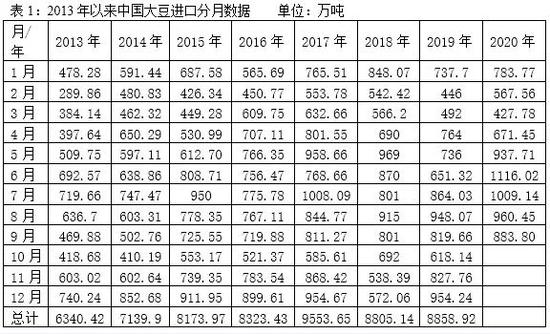 从上图4可以看出,2013年以来,中国大豆进口总体保持快速增长态势,但在2018和2019年由于受到非洲猪瘟对养猪行业严重打击的影响,大豆进口出现明显回落,到2020年出现恢复并在下半年发力,全年进口大豆预期9884万吨,创历史新高。具体数据如下表1。