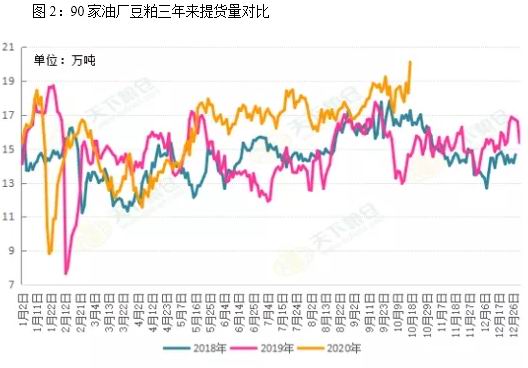 随着一年多来的下游生猪行业的恢复,尤其是规模猪场的集中投资,国内大豆产业链下游饲料行业出现了恢复及增长,反应在豆粕上面,就是油厂豆粕提货量显著增加,并且油厂超高压榨量下豆粕库存增长缓慢,显示豆粕需求的良好恢复及增长。下图1至图3显示了油厂豆粕提货量变化及饲料产量的变化。