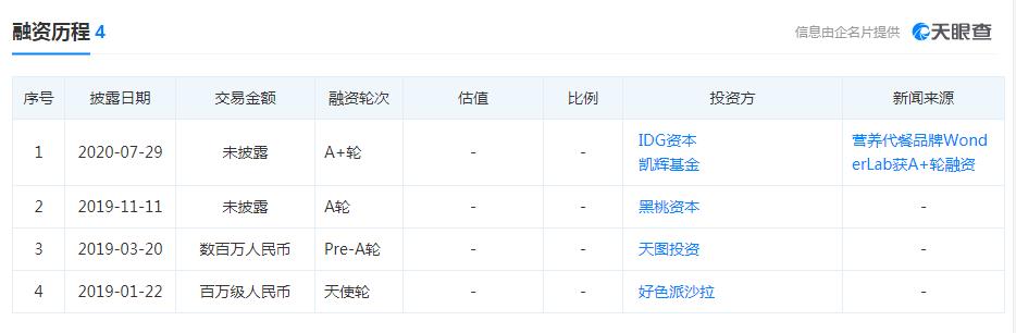 资本同样看好代餐的发展。天眼查数据显示,成立于2019年1月的WonderLab,截至目前已经累计完成4轮融资,投资方包括了IDG资本、凯辉基金等多家投资机构。