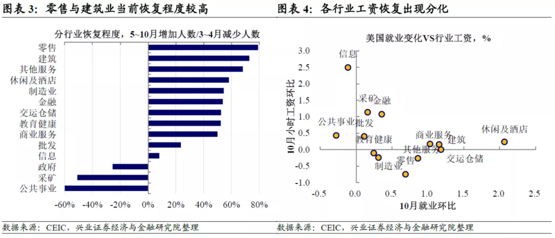 分行业看,服务业是主要拉动,政府就业是主要拖累。休闲及酒店、商业服务、零售等服务业就业增长居前,政府就业则减少26.8万人,主要因为此前临时雇用的2020经济调查相关人员离职所致。从5月至10月的恢复情况来看,当前零售与建筑行业就业恢复程度较高,已修复70%以上,休闲及酒店、制造业、金融等其他行业修复程度不及60%,仍有较大修复空间。此外,各行业工资增长出现分化,10月就业恢复居前的休闲及酒店等行业,小时工资仅小幅改善,就业恢复落后的信息、金融行业,小时工资增速较高,说明当前就业恢复仍是中低收入群体为主。