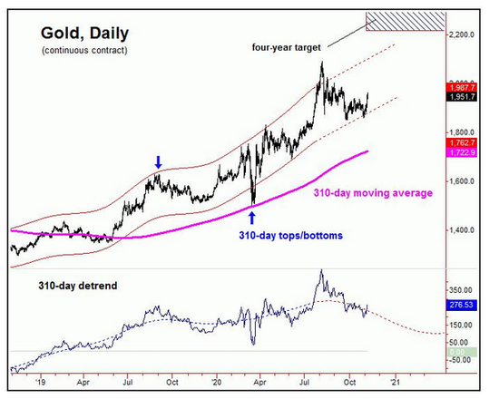 此前有许多分析师认为金价可能会跌破1700,但是我们坚持1930区域是关键性的支撑水平。310天通道底部只要保持完好,市场就不会出现很大的下跌。下一个大级别的调整周期将会出现在310天上,但无论是价格还是时间来看,都还比较遥远。至少再一次测试历史新高之前,黄金不会出现趋势性的逆转。