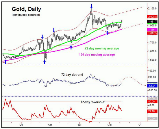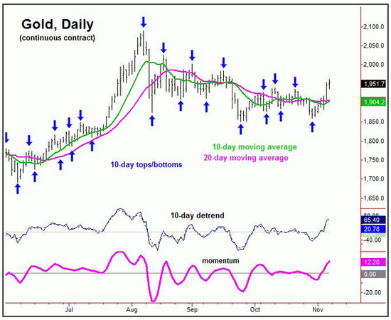 从短期走势来看,10天周期底部已经形成,因此出现了强劲的反弹行情。按照此前的预期,如果空头可以将价格压制在1939/41之下的话,下行压力还是会比较明显。但成功突破之后,反转行情随之而来。筑底反转的走势意味着72天周期的底部已经在9月探明,未来数月将持续保持上行态势为主。