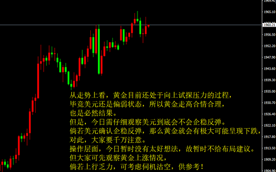 从走势上看,黄金目前还处于向上试探压力的过程,毕竟美元还是偏弱状态,所以黄金走高合情合理,也是必然结果。
