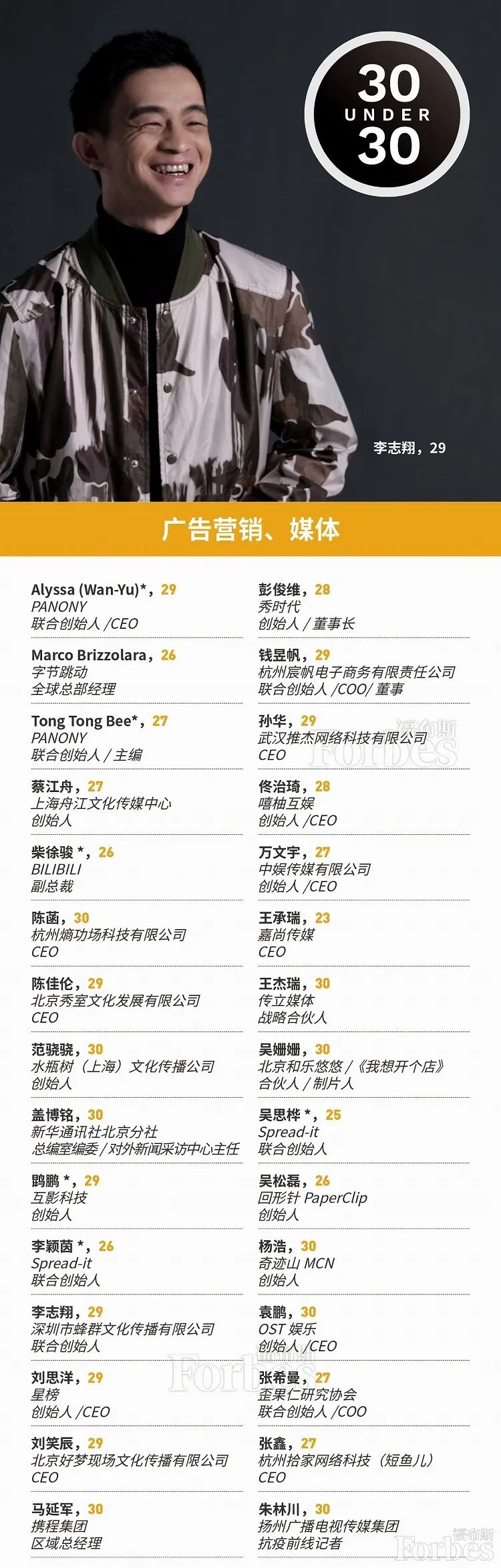 以下为2020福布斯中国30岁以下精英榜(30 Under 30),名字后标*为福布斯亚洲上榜者,名字后标#为截止10月已离开原机构。