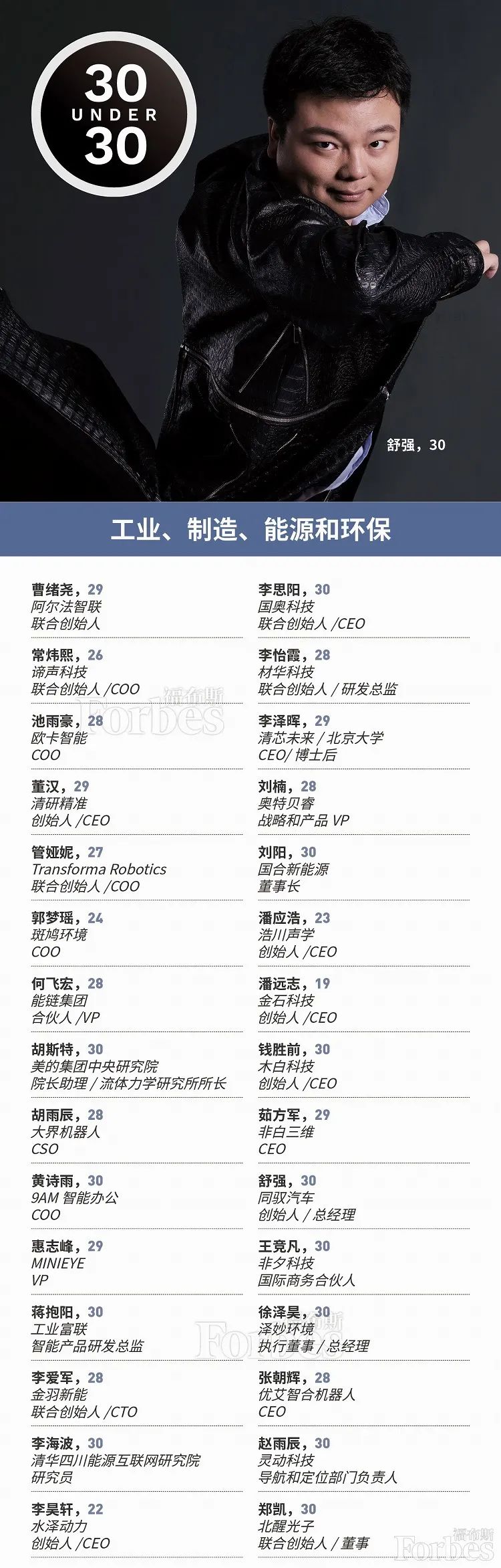 福布斯一贯以前瞻性的目光,寻找那些年龄在30 岁以下,在业内崭露头角,或者是展现出成为未来行业及社会翘楚的潜力年轻人。这项评选被称为30 Under 30(下称U30)。这些青年精英包括创业家、杰出的经理人和演艺、体育、科技及文化界人士。他们是未来的新星,他们砥砺前行,不负韶华,在平凡中铸就伟大!