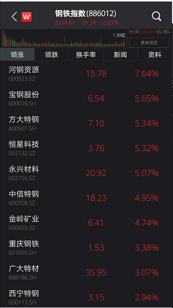 Wind数据显示,截至收盘,钢铁指数涨2.61%。个股中,河钢资源以7.64%涨幅领涨,宝钢股份、方大特钢、恒星科技、永兴材料涨幅均超5%;煤炭指数涨1.04%,个股中,山西焦化以8.26%涨幅领涨,平煤股份涨逾6%,陕西煤业涨4.11%。