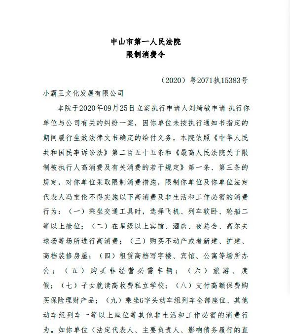 而自今年3月份起,小霸王文化发展有限公司以及公司董事长冯宝伦就陆续被法院列为限制高消费人员,由中山市第一人民法院下发了限制消费令,就多达30份。
