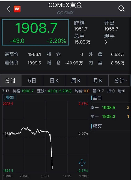 市场风险偏好上升,此前还处于涨势中的金价转眼掉头向下。在亚太市场交易时段,纽约期金价格最高升穿1960美元至每盎司1966.1美元,但在欧洲市场交易时段,金价上演跳水一幕,直线下挫逾2%。