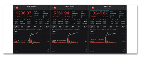 欧洲市场紧跟其后,英、法、德等国基准股指开盘均涨逾1%,盘中直线拉涨,法国CAC40指数一度上涨7.73%,德国DAX指数大涨6.55%,英国富时100指数涨幅也在5%以上。