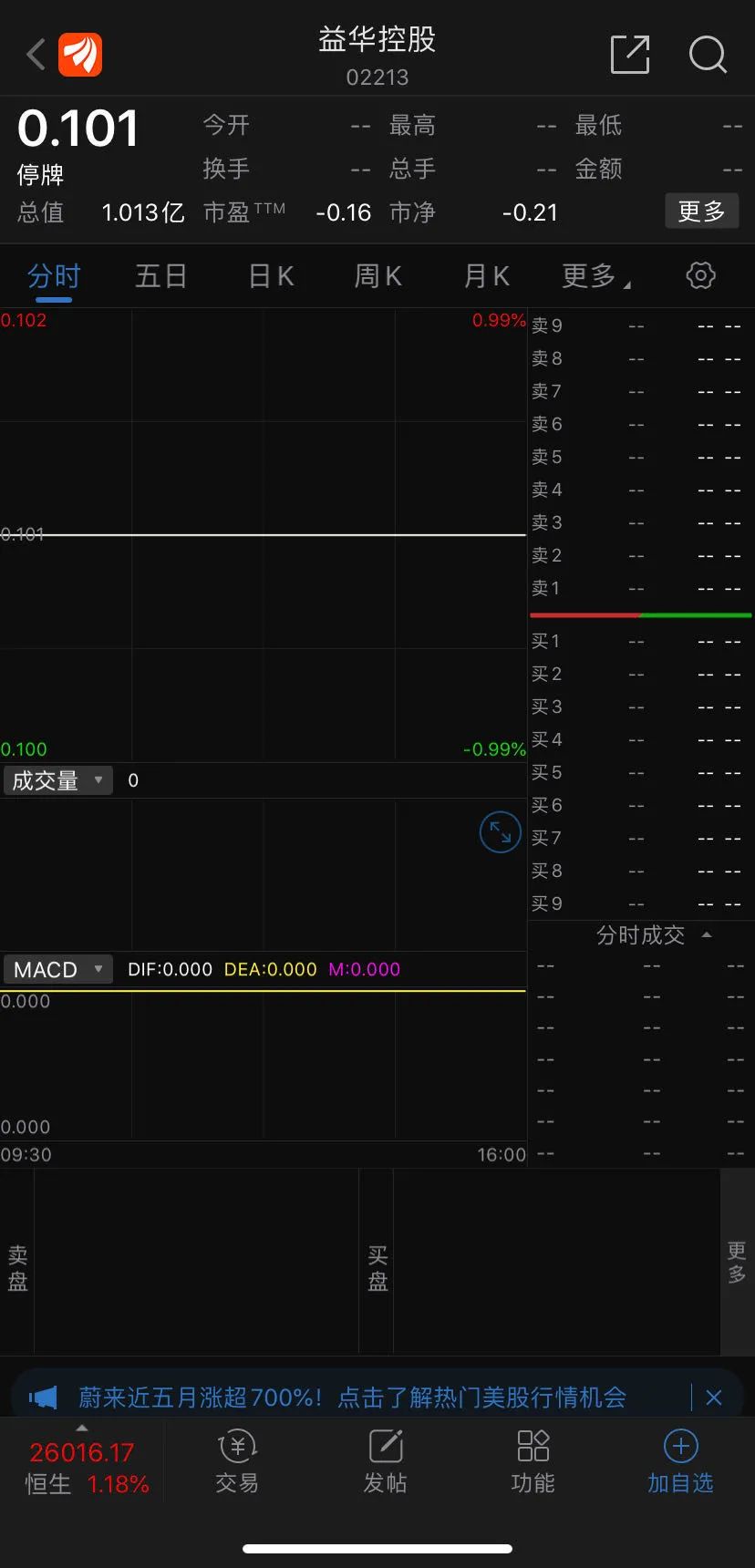 截至目前,益华控股仍处于停牌状态。其历史最高价则出现在2017年10月4日,当天盘中触及2.18港元/股。但停牌前最后一个交易日——今年8月18日,益华控股收盘报0.101港元/股,总市值仅1.01亿港元。