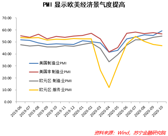 例如,美国10月就业数据复苏程度超市场预期,10月新增非农就业人数63.8万人,较9月新增66.1万有所降低,但高于市场预期的60万人;10月美国失业率为6.9%,较9月的7.9%下降明显。防疫物资、“宅经济”需求、基本消费等需求尽管增速并未持续提升,边际效应也在减弱,但绝对规模仍较大。例如,塑料制品同比增长98%,医疗仪器及器械同比增长30%。