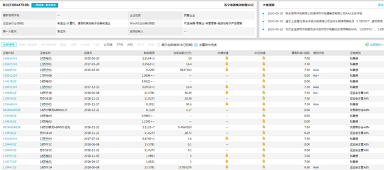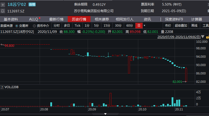 万得数据显示,18苏宁01价格在10月以来大幅下挫,11月9日周一最低值89.2元。18苏宁02昨日最低跌至82.001元。这两只债券剩余期限均不足一年。2023年到期的18苏宁07价格昨日最低跌至78.5元,收盘报78.8元。