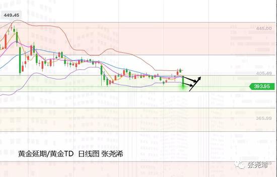 黄金TD:金价昨日晚间低开近3元至403.28元/克后,及跟随国际黄金持续下挫,也一度跌至391.00元/克低点,截止目前周二白盘,相对开盘价振幅12.28元,走势仍处于跟随国际黄金的止跌反弹阶段。整体上,下挫后的承压局面仍在,指标上,日线级别MACD红色柱减弱,KDJ死叉向下,暗示不排除触底反弹后的再度下行。但短线也存在一定的反弹需求。