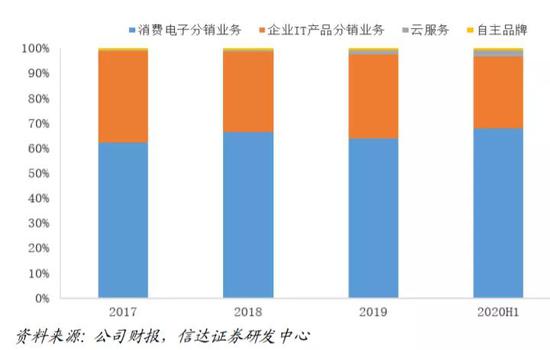 公司发布的三季报显示,前三季度实现营收636.87亿元,同比增长1.13%;归母净利润为3.94亿元,同比下降22.85%;扣非后归母净利润为4.48亿元,同比增长10.11%。从今年上半年的收入构成来看,IT分销收入占比96.79%,云计算及数字化转型占比2.56%。
