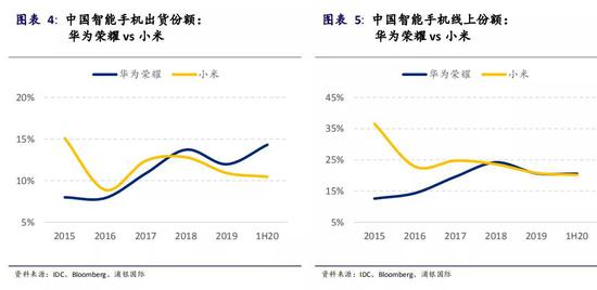 若华为剥离荣耀业务,那中国智能手机竞争环境缓和,有利于小米的增长:基于以上对荣耀智能手机的判断,浦银国际认为荣耀相对于原来的华为来说,竞争力(包括品牌、渠道、采购和产品)要偏弱,因此中国国内智能手机市场竞争环境相较于2019年是缓和的。这种情景给予小米等其他中国品牌更多的空间。因此,浦银国际重申并维持对于小米(01810.HK)的买入评级。