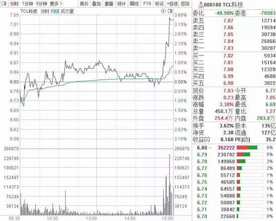 同时,TCL科技尾盘也出现了快速拉升,收盘上涨3.38%。