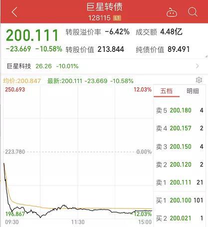 不只是正股,巨星转债价格也出现大跌,跌幅10.58%,报200.111元。