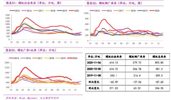 观点汇总:本周螺纹周产量下降4.13万吨,总库存下降87.65万吨,表观消费量环比增加6.62万吨至447万吨,同比增加52.58万吨。本周螺纹库存降幅为5月下旬以来最大,表需也为5月下旬以来最高,表需同比增速达到13%,需求表现持续超出预期。而供应端10月份钢材出口404万吨,环比增加21万吨,进口193万吨,环比减少95万吨,来自进口方面的冲击有所减小。浙江卫视连续两天报道“问题钢筋调查”,数家钢厂生产及发货受到影响,杭州市场库存快速下降至60万吨以下的水平,市场上资源规格开始出现紧缺。供需两端都有发力,使得近期螺纹现货价格持续强势,尤其是杭州市场螺纹现货价格一周涨幅超过200元,已处于全国最高价位区域,唐山钢坯价格在双休日期间也大涨40元至3550元,创年内新高。现货价格的强劲表现,在很大程度上提升了市场预期,盘面价格也大幅上涨。预计螺纹盘面仍将偏强运行。
