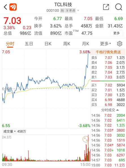另外,另一传闻对象TCL科技股价尾盘也出现明显拉升。截至10日收盘股价上涨3.38%,报收7.03元/股,总市值为986亿元。
