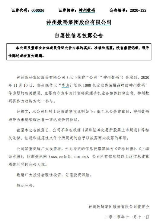11月11日早间,神州数码公告:与华为未就荣耀出售一事达成任何协议。