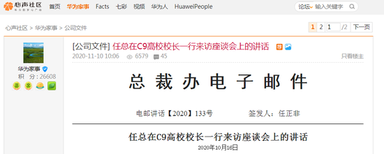 11月10日,华为心声社区官方发布《任总在C9高校校长一行来访座谈会上的讲话》的文件。