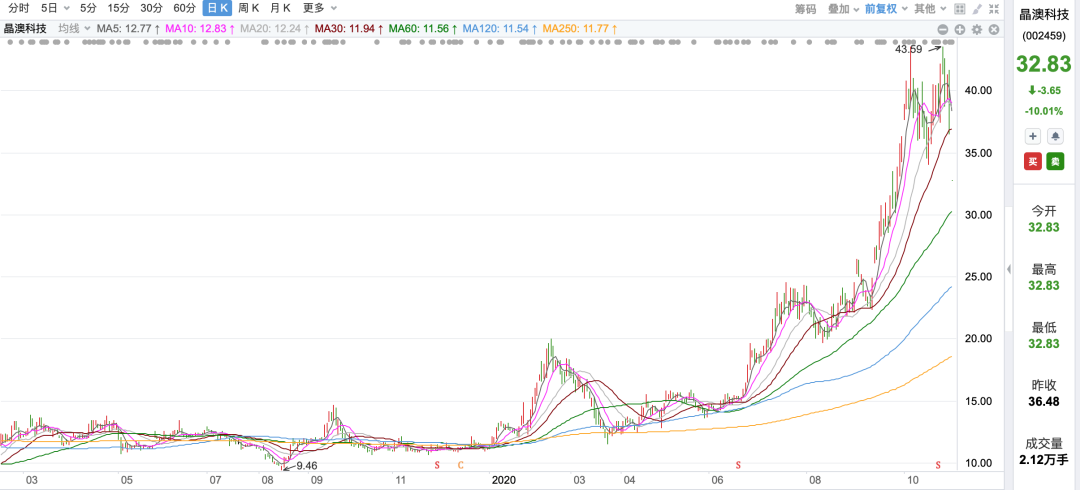 今年4月晶澳科技交出了一份靓丽的成绩单。2019年,晶澳科技实现营业收入211.55亿元,同比增长7.67%;净利润12.52亿元,同比增长74.09%。如此好的业绩增长,伴随着太阳能板块的上涨,晶澳科技的股价也从14元/股的价格,一路上涨至43元/股,翻了三倍多。