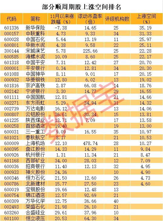 这批股票进入11月以来表现优异,云铝股份、西部矿业、合盛硅业、神火股份、荣盛石化、恒力石化、恒立液压等个股均涨超20%。此外,与不少科技龙头股价超过机构一致目标价不同的是,榜单中的个股大部分股价相比一致目标价依然较低。其中新华保险上涨空间超过35%居首,中联重科、中国石化、华新水泥、宋城演艺等个股上涨空间均超过20%。