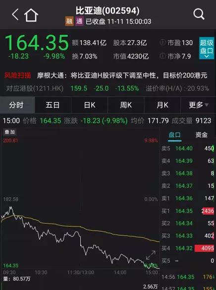 比亚迪早盘小幅低开,随后震荡下探,尾盘放量跌停。截至收盘,该股报164.35元,成交超138.4亿元。市值蒸发超450亿至4230亿元。
