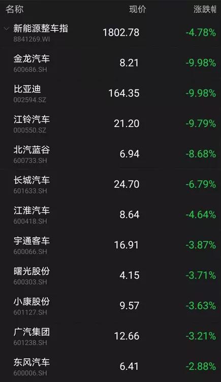 个股方面、金龙汽车、比亚迪、江铃汽车等跌停。北汽蓝谷、长城汽车等跌超6%。