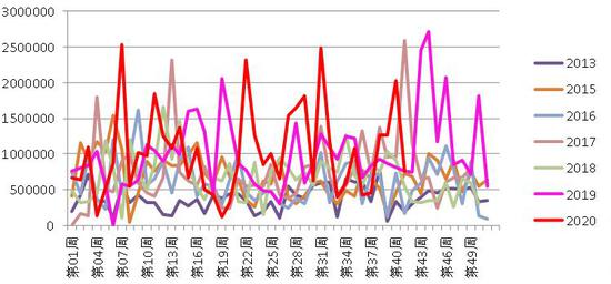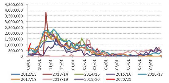 图:美豆对华出口销售(单位:吨)