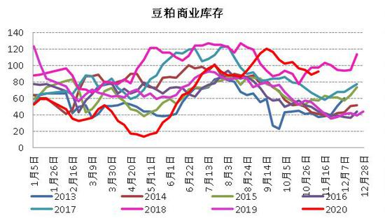 大豆压榨量继续回升至超高水平,令上周豆粕库存有所止降回升,截止10月23日当周,国内沿海主要地区油厂豆粕总库存量92.15万吨,较前一周的88.99万吨增加3.16万吨,增幅在3.55%,较去年同期55.65万吨增加65.58%。本周压榨量将小幅下降至216万吨左右,但仍处于高位,不过近期豆粕需求较好,提货速度也较快,预计本周豆粕库存增幅不大。