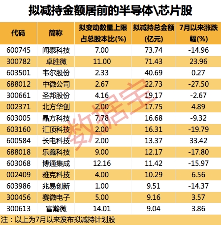 数据宝梳理发现,以上58只半导体、芯片股今年上半年积累了过高的涨幅,58股上半年平均涨幅超过40%,7月以来发布减持计划或多或少与业绩有一定关系。
