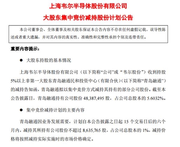 从盘面看,虽然半导体、芯片板块11月11日跌幅领先,板块内即便是业绩相对一般个股,最新收盘日也并没有跑输大盘太多,究竟是何原因导致韦尔股份跌停?巧合的是,11月11日,韦尔股份发布了一份减持计划。