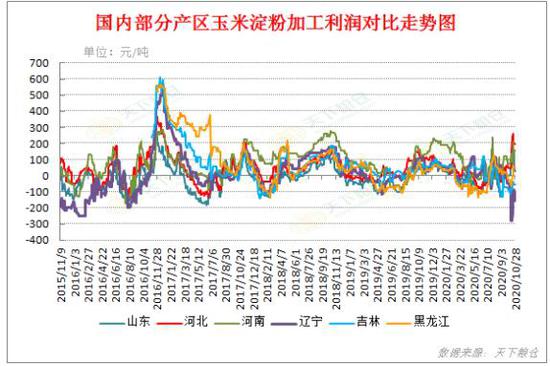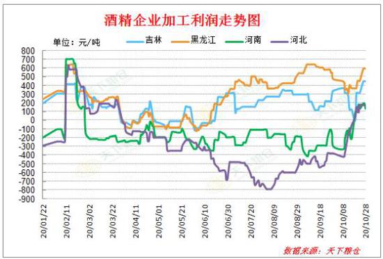根据天下粮仓预估,截至10月28日,河北、河南、黑龙江、山东地区淀粉加工利润为正,最高为河北,最低为山东,辽宁和吉林地区加工亏损。吉林、黑龙江、河北、河南地区酒精加工利润分别为448/595/173/133元/吨。整体来看,我国淀粉和酒精加工厂加工利润尚可。
